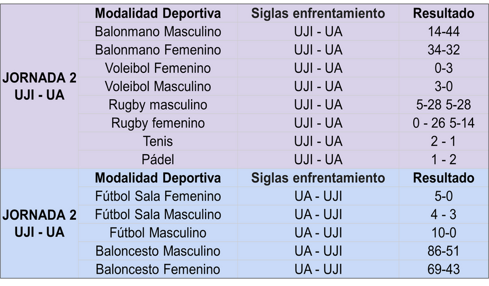 La segunda jornada de la liga CADU ha enfrentado a la Universidad de Alicante y a la Universidad Jaume I por parte del grupo 1, mientras que en el grupo 2 el enfrentamiento ha sido entre la Universidad Católica de Valencia y la Universidad Politécnica de Valencia.